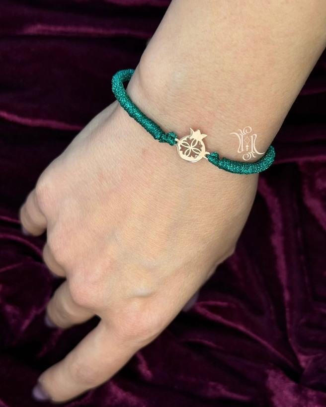 دستبند بافت طلا زنانه مدل پلاک انار با نخ سبز